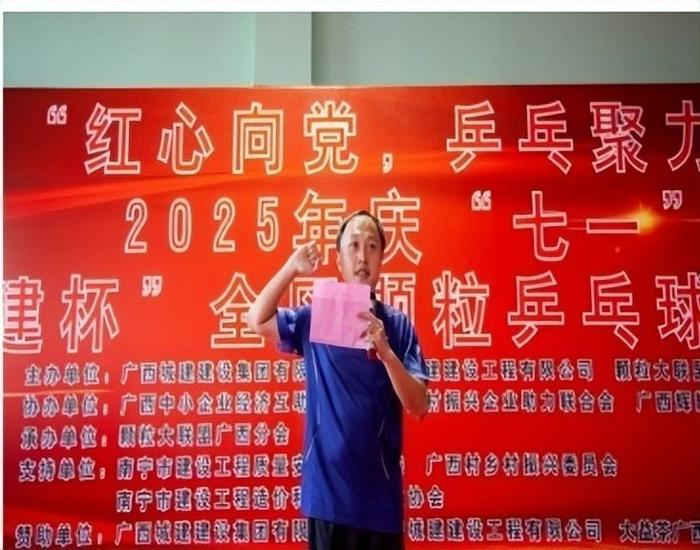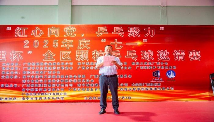 7 月 5 日上午 8 时,为庆祝中国共产党成立 104 周年暨 2025 年 “城建杯” 全区乒乓球邀请赛在南宁市体育场乒乓球馆举行。由广西城建集团有限公司、南宁城建建设集团有限公司、颗粒大联盟广西分会主办;广西中小企业经济互助商会、广西乡村振兴企业助力联合会、广西辉耀乒乓球俱乐部协办,大益茶广西服务商、南宁醇静贸易有限公司、广西汾联酒业有限公司、广西抿元投资控股集团有限公司为本次比赛提供全方位的赞助与保障,让我们能够以饱满的热情和高昂的斗志,共同见证到这场乒乓盛宴!