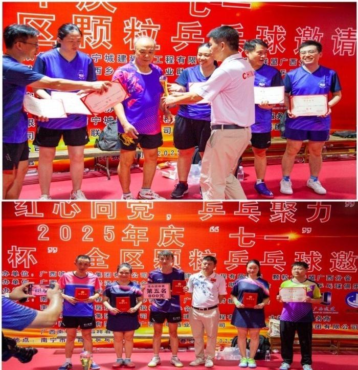 颁奖仪式上,广西城建集团有限公司总裁陆志成为获得乒乓球混合团体赛冠、亚、季的队伍(冠军:广西颗粒分会一队,亚军:广西城建集团队,季军:广西北海颗粒分会队)颁奖。广西城建集团副总经理黄军与广西颗粒分会长李艾生向荣获嘉宾、会长乒乓球 “双打” 组前三名的队员(第一名:广西颗粒分副会长文济华、南宁颗粒分会副会长陈璐,第二名:广西颗粒分会副会长周开胜、北海颗粒分会会长孙宏宇,第三名:广西颗粒分副会长兰谷、柳城颗粒分会会长冯思芳)颁奖并合影留念。